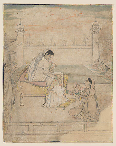 This work of art is currently on loan to the museum.The artist rendered the veil of this elegant, bejeweled lady as a diaphanous cloth through which her long braided tresses can be seen. She holds a flower as her maid offers a garland of blossoms. In the distance a group of women play music on string and percussion instruments.