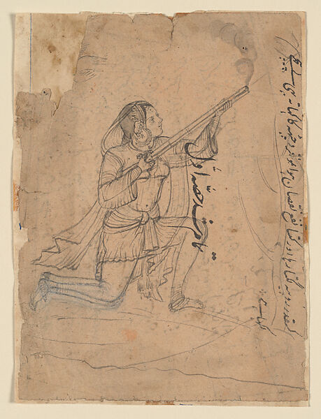 - Title:Huntress with matchlock (on a page with unrelated Persian and Urdu inscriptions)