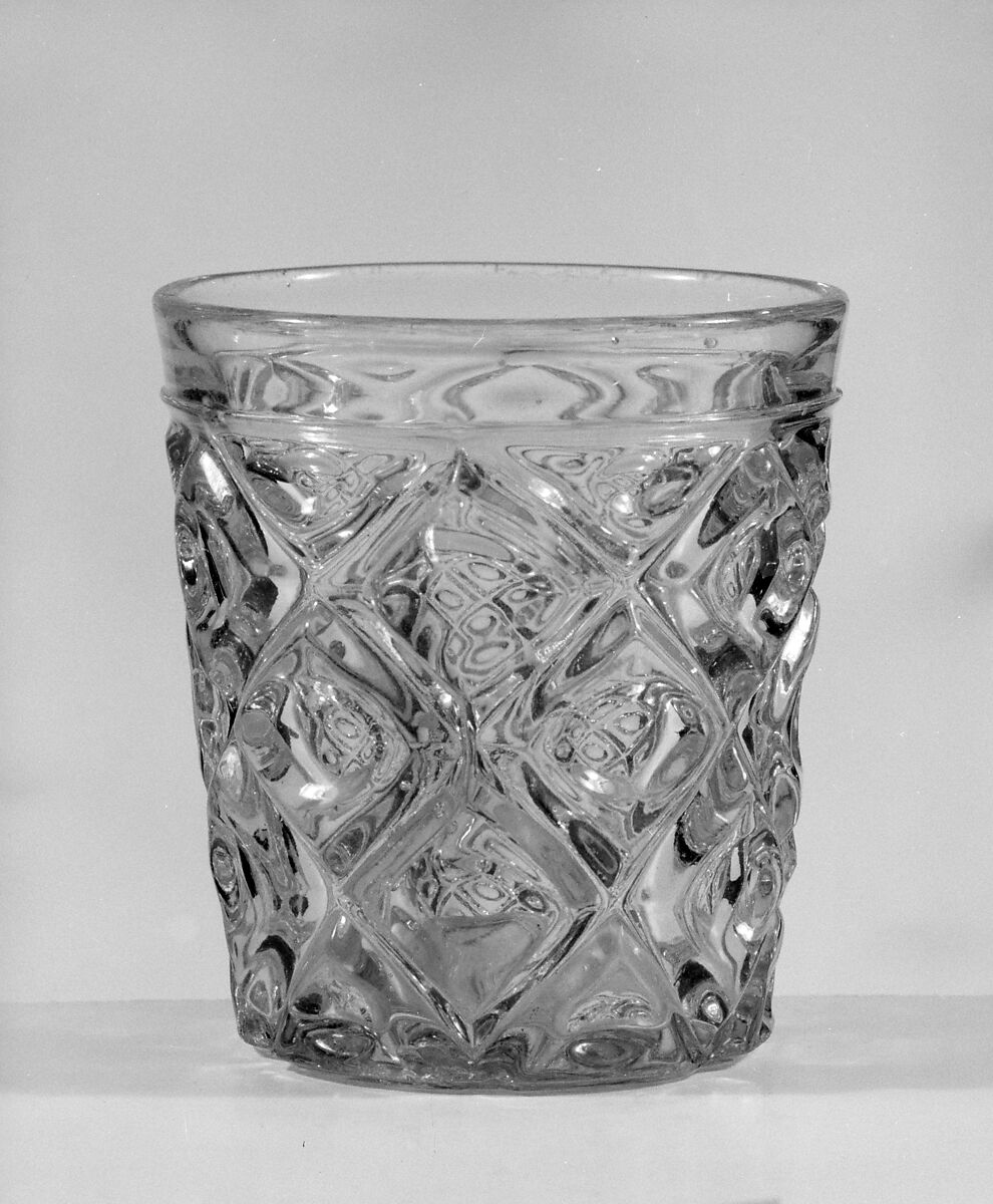 With the development of new formulas and techniques, glass-pressing technology had improved markedly by the late 1840s. By this time, pressed tablewares were being produced in large matching sets and innumerable forms. During the mid-1850s, colorless glass and simple geometric patterns dominated. Catering to the demand for moderately-priced dining wares, the glass industry in the United States expanded widely, and numerous factories supplied less expensive pressed glassware to the growing market. At the Exhibition of the Industry of All Nations at New York’s Crystal Palace in 1853, for example, the New England Glass Company exhibited 130 pieces of one design, "consisting of bowls, tumblers, champagnes, wines, and jelly glasses." This object belongs to one such service. Although the glass manufactory is not known, the glassware is very typical of the large services that were very popular with America’s middle class in the nineteenth century.