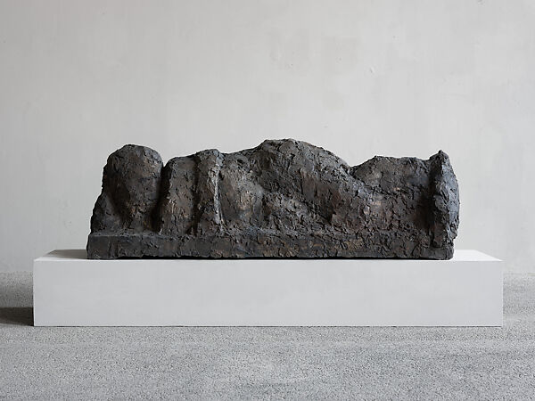 Hans Josephsohn devoted his sculptural practice to the human figure. Like many of his works, this one takes the reclining figure as its subject, while others depict portraits, the figure standing at half or full-length, as well as reliefs. A distinctive ambiguity permeates this particular work. It can be read as one figure, on its side or back, caught in repose or as two figures entwined, one atop another. It can also be seen as a landscape, or a massing of material that yields to abstraction. The dark patina suggests treated metal but also conjures dirt, the first and most elemental material of sculpture; one might even think of the biblical story where God "formed man of the dust of the ground" (Genesis 2:7). Roughly hewn, Untitled’s surface implies a process of accretion and addition, with its finish of thickets and knots, places for the eye to get lost and for one reading of the work to merge into another.