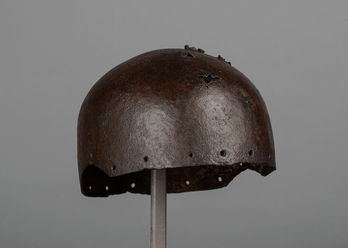 This rare small sallet (celatina) is stamped with a partially effaced mark attributed to the Missaglia family, the leading armorers of Milan in the mid-fifteenth century. It is one of approximately 100 helmets that were included in the Chalcis group, a unique time capsule comprising about 450 pieces of fourteenth and fifteenth century armor that were abandoned in Chalcis, then a Venetian outpost in Greece, after the city was conquered in 1470, and were not rediscovered until 1840. The Chalcis group, of which more than 200 items are part of The Met’s permanent collection, constitutes the largest selection of elements of fifteenth century armor anywhere in the world. The helmet shows significant damage from projectiles, probably musket balls and crossbow bolts. Whether the damage was caused during the siege of Chalcis or later is impossible to know. Fortunately, and unlike many other pieces in the Chalcis group, this helmet was never restored, other than surface cleaning, and remains largely in the condition in which it was found.