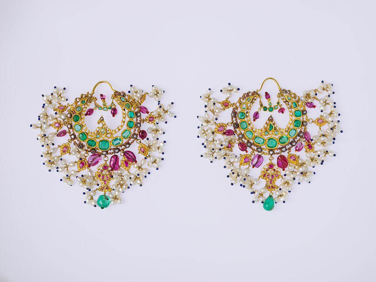 The pair of earrings is an outstanding example of the opulence and style of late Mughal jewelry, produced within the courtly context of the "nautch" - or the lavish dance culture of "nautch girls" (dancing girls). Intimately woven around styles of courtly dance, such jewelry was worn by accomplished courtesans - mainly at the courts of Lucknow and Hyderabad - who were skilled in the arts of music, dance, and recitation. Their main patrons were the Indian nobility, who appreciated the delicate nuance of every enacted gesture and movement of the performer, which were beautifully enhanced by the lavish jewelry worn. With the arrival of the British, such cultural settings were infused with new patrons, and also artists who observed the scene, ushering in a popular genre subject in "Company painting".