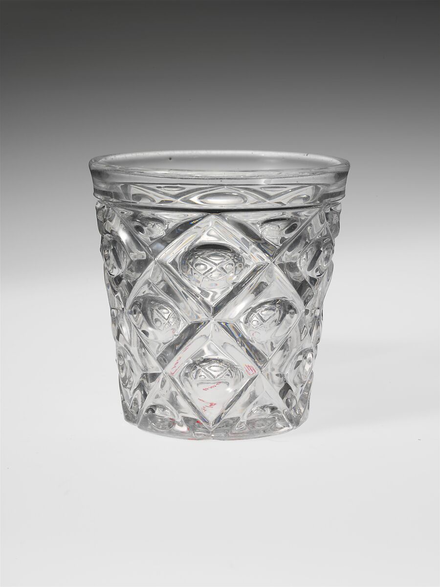With the development of new formulas and techniques, glass-pressing technology had improved markedly by the late 1840s. By this time, pressed tablewares were being produced in large matching sets and innumerable forms. During the mid-1850s, colorless glass and simple geometric patterns dominated. Catering to the demand for moderately-priced dining wares, the glass industry in the United States expanded widely, and numerous factories supplied less expensive pressed glassware to the growing market. At the Exhibition of the Industry of All Nations at New York’s Crystal Palace in 1853, for example, the New England Glass Company exhibited 130 pieces of one design, "consisting of bowls, tumblers, champagnes, wines, and jelly glasses." This object belongs to one such service. Although the glass manufactory is not known, the glassware is very typical of the large services that were very popular with America’s middle class in the nineteenth century.