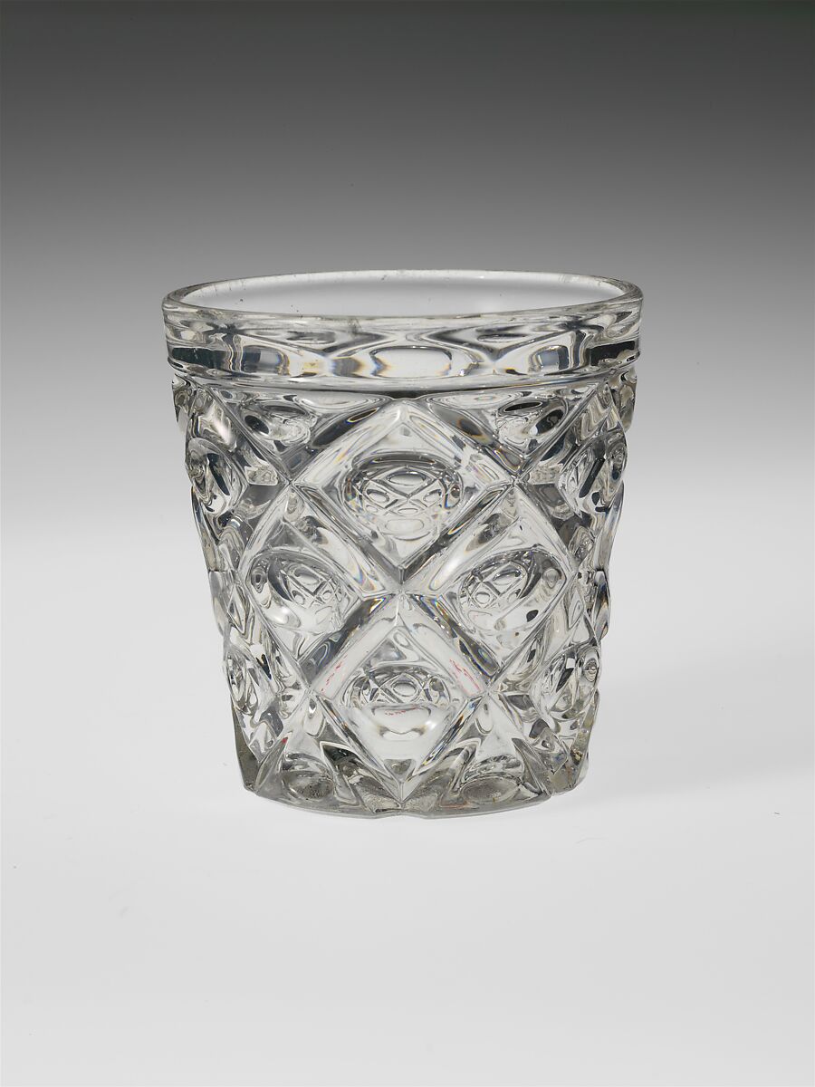 With the development of new formulas and techniques, glass-pressing technology had improved markedly by the late 1840s. By this time, pressed tablewares were being produced in large matching sets and innumerable forms. During the mid-1850s, colorless glass and simple geometric patterns dominated. Catering to the demand for moderately-priced dining wares, the glass industry in the United States expanded widely, and numerous factories supplied less expensive pressed glassware to the growing market. At the Exhibition of the Industry of All Nations at New York’s Crystal Palace in 1853, for example, the New England Glass Company exhibited 130 pieces of one design, "consisting of bowls, tumblers, champagnes, wines, and jelly glasses." This object belongs to one such service. Although the glass manufactory is not known, the glassware is very typical of the large services that were very popular with America’s middle class in the nineteenth century.