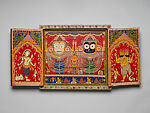 This shrine is in the form of a triptych dedicated to the Vishnu emanation of Jagannatha, "Lord of the Universe," a form of Krishna. It served as a devotional setting for the veneration of this much-loved Krishna ensemble, consisting of Lord Jagannatha, accompanied by his half-brother Balabhadra (nee Balarama) and his sister Sudhadra. Together they form a holy triad, distinguished each by body color, with Jagannatha (Krishna the "dark Lord"), shown with a dark complexion, Balabhadra light and Subhadra white. They became the focus of a major center of Krishna worship, and the temple dedicated to them at Puri, Odisha, in coastal eastern India, assumed the status of one of the four great pilgrimage centers (dham) of Hinduism. Puri thus attracted vast numbers of pilgrims from all over India to its Jagannatha temple, built in its present form around 1135. This portable shrine would have served as a surrogate location for a devotee’s worship, likely carried by an itinerant priest to villages where followers could imbibe the presence of Lord Jagannatha from afar.