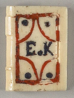 Realistic closed book charm, incised in a traditional bookbinding design with four large corners on both covers. The lines which make the borders and corners are filled with red wax; decorative dots, central motifs are filled with black wax. The front cover has the "E.K" and the back has two intersecting curves, similar to an infinity motif. The rounded spine has two raised bands, one thick (top), one thin (bottom). -- description by Mindell Dubansky in consultation with Lynn Heckman