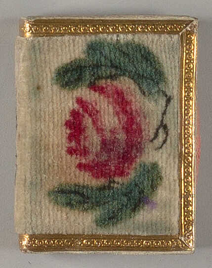 This white velvet pincushion is painted with a single two-leaf red rose, on both covers. Sally is handwritten in black on the spine. The edges of the binding are bordered with thin strips of gold paper embossed with a dotted pattern. The body of the pincushion is pink silk stuffed with an unknown material. -- description by Mindell Dubansky in consultation with Lynn Heckman