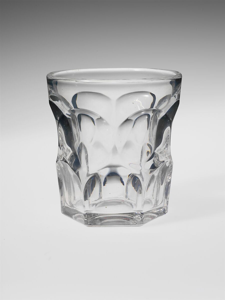 With the development of new formulas and techniques, glass-pressing technology had improved markedly by the late 1840s. By this time, pressed tablewares were being produced in large matching sets and innumerable forms. During the mid-1850s, colorless glass and simple geometric patterns dominated. Catering to the demand for moderately-priced dining wares, the glass industry in the United States expanded widely, and numerous factories supplied less expensive pressed glassware to the growing market. At the Exhibition of the Industry of All Nations at New York’s Crystal Palace in 1853, for example, the New England Glass Company exhibited 130 pieces of one design, "consisting of bowls, tumblers, champagnes, wines, and jelly glasses." This object belongs to one such service. Although the glass manufactory is not known, the glassware is very typical of the large services that were very popular with America’s middle class in the nineteenth century.