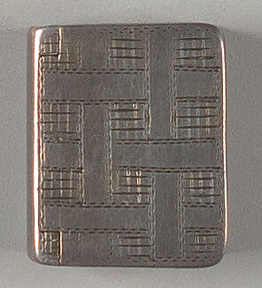 This silver book with rounded corners, has an invisible hinge on the top cover. It is engraved in a basketweave pattern on both covers. The spine has faint indications of transverse lines, in imitation of book spine bands. The edges are lightly engraved with parallel lines, to appear as pages. -- description by Mindell Dubansky in consultation with Lynn Heckman