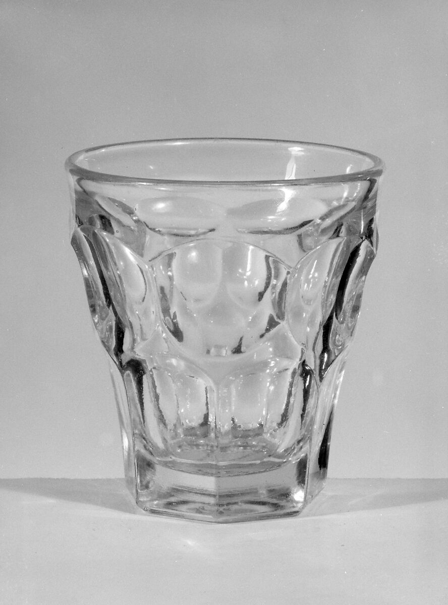 With the development of new formulas and techniques, glass-pressing technology had improved markedly by the late 1840s. By this time, pressed tablewares were being produced in large matching sets and innumerable forms. During the mid-1850s, colorless glass and simple geometric patterns dominated. Catering to the demand for moderately-priced dining wares, the glass industry in the United States expanded widely, and numerous factories supplied less expensive pressed glassware to the growing market. At the Exhibition of the Industry of All Nations at New York’s Crystal Palace in 1853, for example, the New England Glass Company exhibited 130 pieces of one design, "consisting of bowls, tumblers, champagnes, wines, and jelly glasses." This object belongs to one such service. Although the glass manufactory is not known, the glassware is very typical of the large services that were very popular with America’s middle class in the nineteenth century.