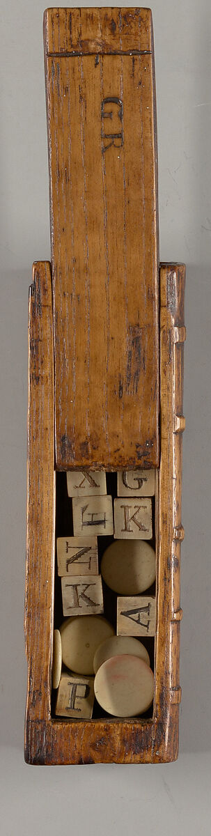 Long, thin game box carved of solid ash in the shape of a small book., The sliding lid is also cut from solid ash, with "GR" carved in the top surface. Otherwise, undecorated, with five raised bands on the spine. Includes eleven ivory dice with letters inscribed on all sides with a black colorant for contrast, and ten blank bone disks with rounded edges. Handmade and manufactured games for children and adults housed in book boxes, such as card games, dominoes, word games, chess/checkers, etc. have been popular since at least the 19th century and remain so today. This simple book box manages to beautifully capture the essential aesthetic elements of a leather binding from the period, adding interest and value to the enclosure. Lynn Heckman's business card and small price tag inside. -- description by Mindell Dubansky in consultation with Lynn Heckman