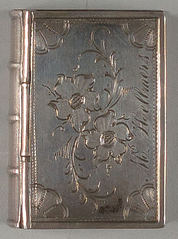 Both covers of this engraved box are identical with the exception of the name M. Hellmers on the front, engraved parallel with the foredge. The covers have thin, raised edges, with engraved border made of dotted lines and three-loved floral motifs in the corners. An engraved leafy two-flowered motif is in the center of each cover. All edges are striated to resemble pages. The spine has five raised bands, evenly spaced. -- description by Mindell Dubansky in consultation with Lynn Heckman