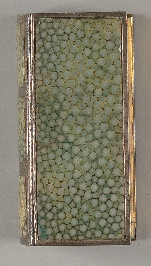 Miniature inkwells for traveling occasionally took the form of books, some with specific titles such as Baedeker travel guide. This luxurious variant has gilded metal edges and is covered in shagreen edged with engraved silver borders and two transverse bands on the spine made of the same materials as on the edges. The interior of the box is separated into three compartments with four circular holes with places for two glass jars with gold lids (one glass jar is missing). -- description by Mindell Dubansky in consultation with Lynn Heckman