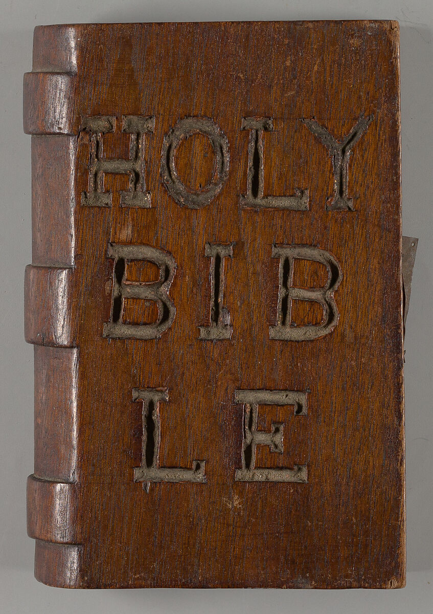 This faux bible is carved from a solid piece of wood. The rounded spine features three wide, raised bands, carved in relief. The title HOLY/BIB/LE is incised into the front cover. The back cover is undecorated, and all edges are painted gold. On the foredge is a false clasp of pierced sheet metal cut in an "H" motif, that was secured using a small flat-head nail at each corner (one missing).-- description by Mindell Dubansky in consultation with Marijn Manuels