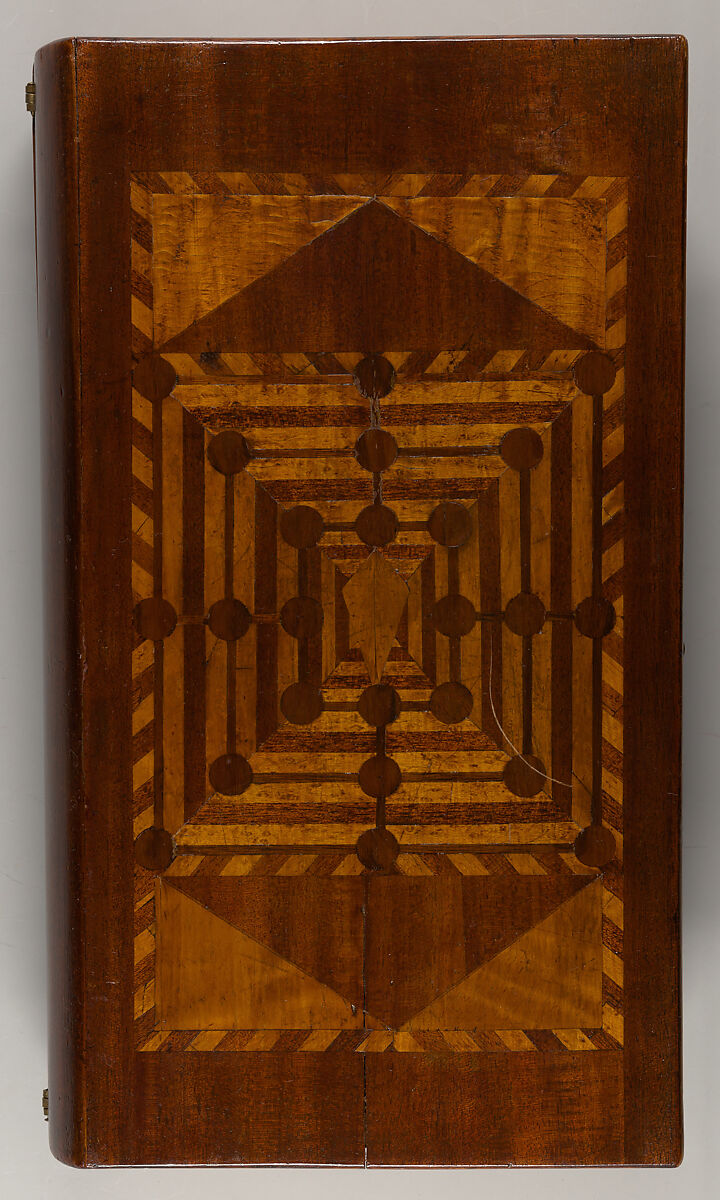 The box consists of two symmetrical halves, constructed with iron or steel fasteners, and subsequently covered with veneer on all surfaces. The hinge in the center of the rounded spine, and open flat to reveal a marquetry backgammon board in mahogany, walnut and bird's eye maple veneer against a whitewood background. On the exterior, on one side carries a checker or chess board design; on the other side displays the board for the mühle game - both executed in the same three species of veneer. The edges of the box are veneered in alternating strips of mahogany and whitewood to resemble book pages.-- description by Mindell Dubansky in consultation with Marijn Manuels