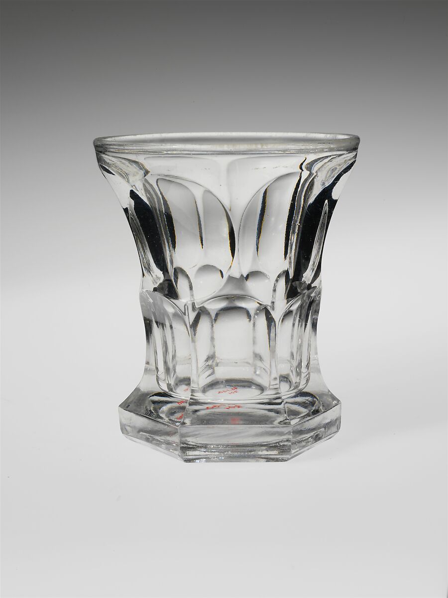 With the development of new formulas and techniques, glass-pressing technology had improved markedly by the late 1840s. By this time, pressed tablewares were being produced in large matching sets and innumerable forms. During the mid-1850s, colorless glass and simple geometric patterns dominated. Catering to the demand for moderately-priced dining wares, the glass industry in the United States expanded widely, and numerous factories supplied less expensive pressed glassware to the growing market. At the Exhibition of the Industry of All Nations at New York’s Crystal Palace in 1853, for example, the New England Glass Company exhibited 130 pieces of one design, "consisting of bowls, tumblers, champagnes, wines, and jelly glasses." This object belongs to one such service. Although the glass manufactory is not known, the glassware is very typical of the large services that were very popular with America’s middle class in the nineteenth century.