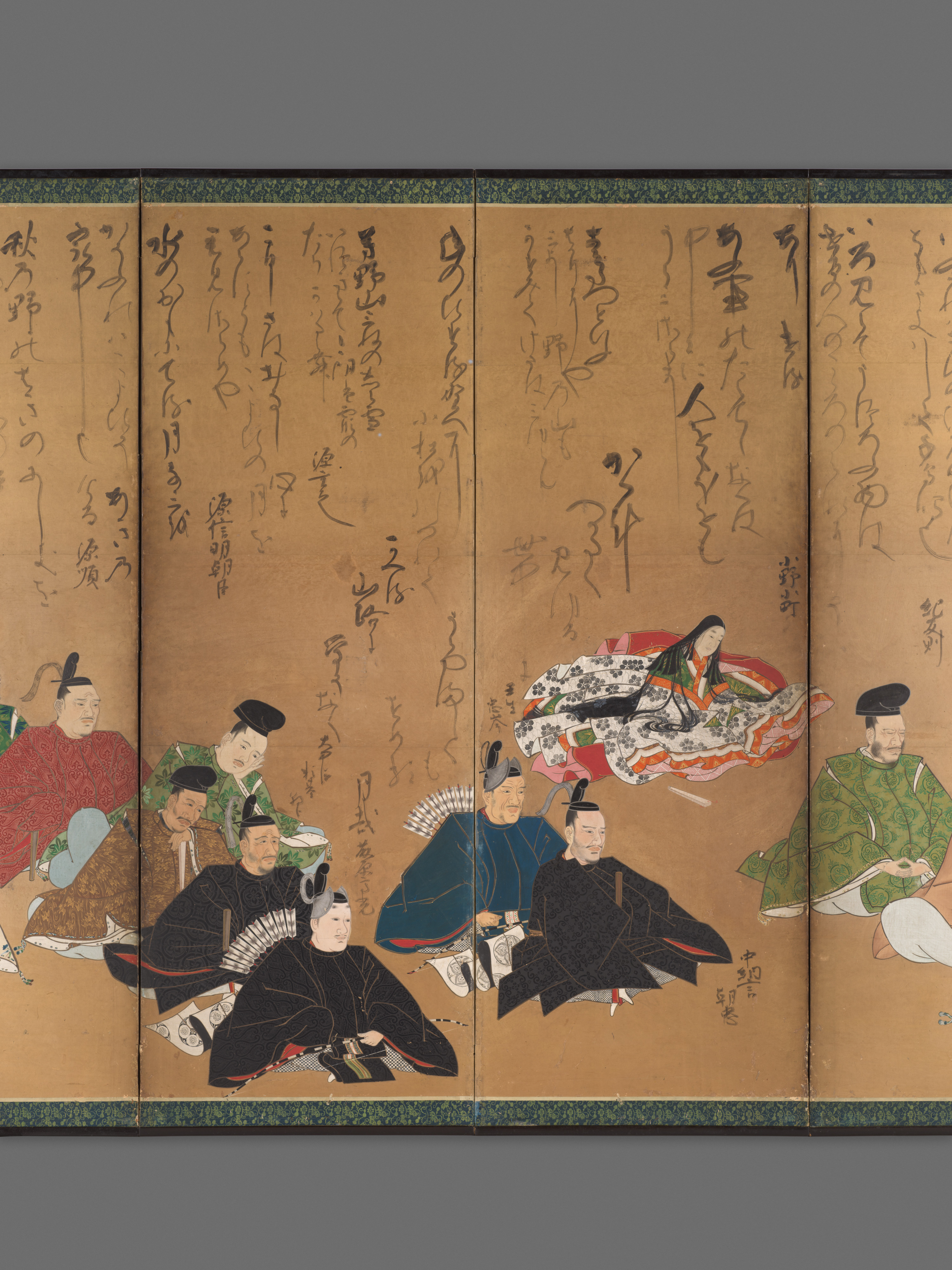 This pair of screens portraying the Thirty-Six Poetic Immortals is one of the earliest and finest surviving examples of the subject in the full-size folding-screen format. In compiling his roster of thirty-six eminent Japanese poets, the courtier-poet Fujiwara no Kintō (966–1041) sought to identify those who had been the most esteemed in the composition of waka, or court poetry. Two were famous monks, five were court ladies, and the rest were men of the court.