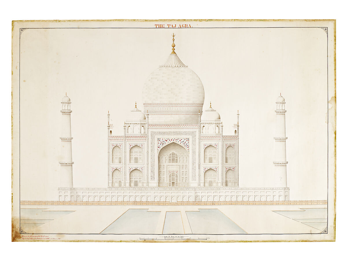 This watercolor depicts the most celebrated example of Indo-Islamic architecture: the Taj Mahal mausoleum built for Mumtaz Mahal (d. 1632), the wife of Emperor Shah Jahan (r. 1628-58) at Agra. Inscriptions indicate that this work was made in 1880 by Indian artist Koodrutoollah, who is identified as a draughtsman working for the British East India Company. This painting is characterized by a blend of European and Indian styles. The crisply linear perspective of this work is informed by European engineering drawings, and also reflects the rise of photography in the mid nineteenth century. Meanwhile the Mughal Indian aptitude for meticulous detail is seen here in the intricately depicted pietra dura floral and calligraphic inlay on the building’s facade.