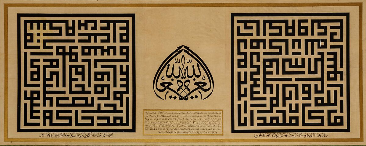 This monumental calligraphic composition combines two styles – geometric square kufic, and Muthanna mirror script – , and exemplifies the mastery of calligraphy which was considered a high art form across the Ottoman empire. Beginning in the 18th century, individual calligraphic panels such as this example became increasingly popular in the Ottoman realm. The inscriptions aim to strengthen the religious value and include here "Glory to God" in the central mirror calligraphy, flanked by verses from the Qur’an inscribed into the geometric kufic square panels. Such panels often are of monumental size, as they were intended to hang on walls of wealthy people’s houses or palaces, as well as religious public buildings.