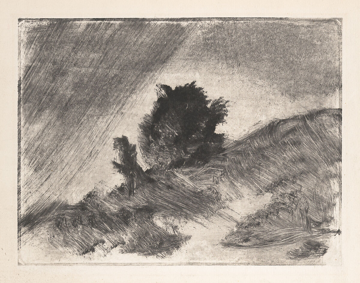 Relatively early in his experimentation with the monotype process, Degas produced a small group of black-and-white landscapes in which he explored the variety of textural effects achievable through the manipulation of ink on an unincised plate. This example of a windswept hillside with its clump of trees or shrubs at center and the dramatic striations of rain across the upper left, directly references Rembrandt, whose work Degas greatly admired, specifically one of his most famous prints "The Three Trees" (29.107.31).