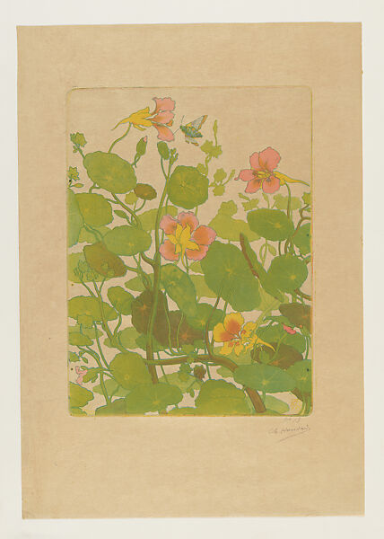 Houdard was among the pioneering practitioners of color printmaking during its revival at the turn of the twentieth century, specializing in fine-grained color aquatint. This work was printed from three plates and the three registration marks (used to align the plates) are visible as dots along the left edge. With its sinuous lines, distinctive round leaves, and bonnet-like flowers, the nasturtium plant was a popular motif adopted by art nouveau designers in the 1890s. Houdard maintains a naturalist interest in his subject, evident in the variation of color among the four known impressions of this print that corresponds to the variety found in nasturtium blooms, ranging from a deep burgundy, to orange-red, to peach and salmon pinks.