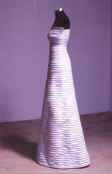 Since the 1930s dresses constructed with an unbroken spiraling of cloth have come to be associated with antique traditions. In this example, a whimsical manifestation of that strategy is carried to the extreme. Surprisingly, Cat Chow's garment has some precedent: in his 1929-30 "Taxi" dress Charles James conceived of a one-seam garment that could unzip in a spiral around the body, though unlike Cat Chow's design, his garment could not be completely unzipped. Later, in the 1930s, Elsa Schiaparelli inserted large plastic zippers as a decorative, as well as functional, device in her garments. Chow weds the classicizing strategy of a spiral construction with Schiap's interest in the decorative possibilities of the functional closure.