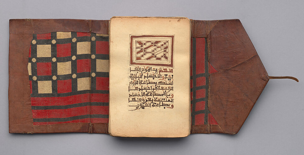 This prayer book comprises a compilation of loose folios that are held together within a front and back papier-mâché cover. Leather bands are attached to the covers to wrap the unbound manuscript. This construction is characteristic of West African devotional bookmaking traditions. The text is written in the barnavi script (particular script from Borno), common in Nigeria and Chad and distinguished by bold application, round letters, and short letter-shafts. Additional characteristics of this prayer book are the decorative geometrical tables that serve to divide chapters and sections. These are composed as geometric patterns with simple repeat motifs—circles, cross, double-T, and others, which are rendered as colorful grids in red, brown, and sparkling yellow. Typical for Dala’il al-Khayrat prayer books, this example includes illustrations of the holy sites of Mecca and Medina, rendered in an abstract geometric style. In addition to reflecting the artistic vibrancy of West and Sub-Saharan Africa, these patterns and themes bear talismanic and other meanings that surpass the devotional function of such manuscripts.
