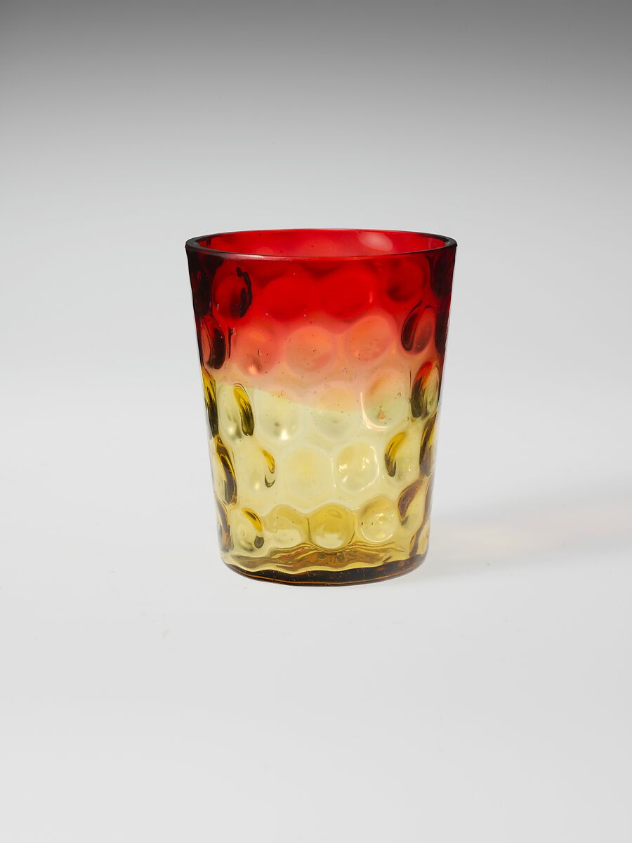 This tumbler, decorated with the "inverted thumbprint" pattern and "sunburst" pattern on the bottom, has been attributed to the West Virginia firm of Hobbs, Brockunier and Company. By 1879, this was one of the largest glass factories in the United States.