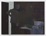 In his moody paintings, Sanya Kantarovsky stages scenes of psychological intensity. Breach depicts an enigmatic visual encounter between a man and an adolescent in a bedroom. Standing at a slightly opened door, the balding man hovers portentously over the shirtless body of a sleeping youth draped across a single bed. Without a fixed narrative, the painting invites interpretations ranging from cruelty to concern. The perpetrator of the titular breach might well be the invasive gaze of the viewer.