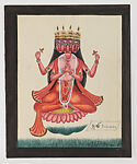 A demoness (dakini) with red tongue exposed, dressed in yellow bodice and red dhoti and shawl, wearing garlands and pearls, and wielding a sword. Inscribed in Bengali and English.