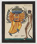 The monkey general Hanuman of the Ramayana, Rama’s staunchest ally, is shown battling the mighty demon (rakshasa) Ravana, Lord of Lanka. Ravana, ten-headed and with twenty sword-wielding arms, is flying through the air to attach Hanuman. Ravana is dressed is splendid yellow robes and his complexion is dark blue, mimicking in both Rama’s appearance, alluding to the seeds of wisdom and goodness within his demonic heart. Inscribed in Bengali and English.