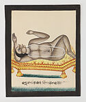 A female demon (rakshasi) lying on a bed of nails. Her dark complexion and physiognomy may be compared to that of the dakini, a complex demonic spirit most often associated with the devouring of humans (cf. no. 3). Inscribed in Bengali