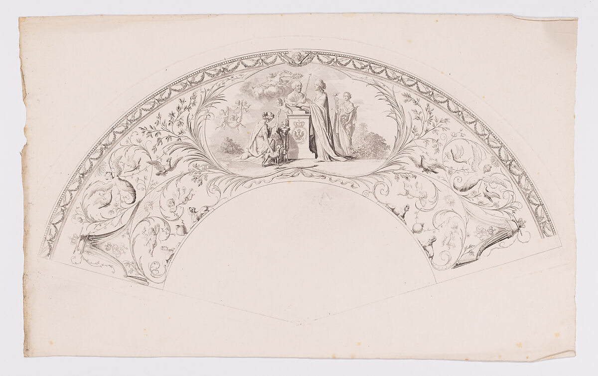- Title:Fan leaf with allegory showing a bust of Friedrich Wilhelm II being crowned by Fame
