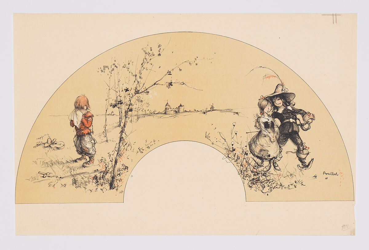 - Title: Fan leaf depicting little boy weeping because another has his girl