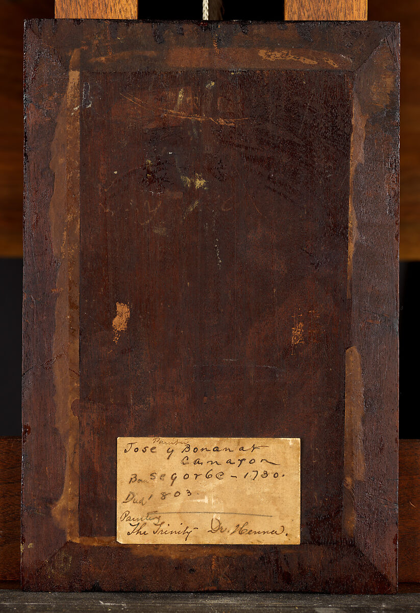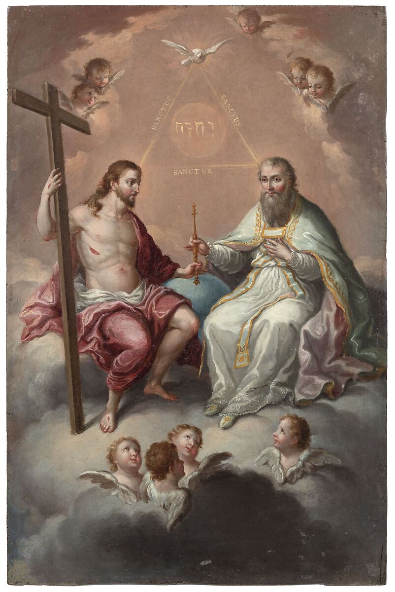 José Campeche, the son of a formerly enslaved artisan of African descent, established himself as the leading painter in Puerto Rico during the last decades of the eighteenth century. His ascendance coincided with a period of military and economic reform that transformed the city of San Juan into a thriving port with a growing and increasingly diverse population. Campeche flourished as the preferred painter of the island’s political and ecclesiastical elite, who commissioned portraits as well as religious images for both public and private worship. This representation of the Holy Trinity was made as a devotional aid for individual prayer. The three figures of the Trinity are connected at the vertices of a triangle with the Tetragrammaton—the four-letter Hebrew theonym (Yahweh)—at its center, in a luminous manifestation of God’s presence. Each side of the triangle is inscribed with the Latin word “Sanctus,” an expression of praise that derives from the prophet Isaiah’s vision of the throne of God: “Holy, holy, holy.”