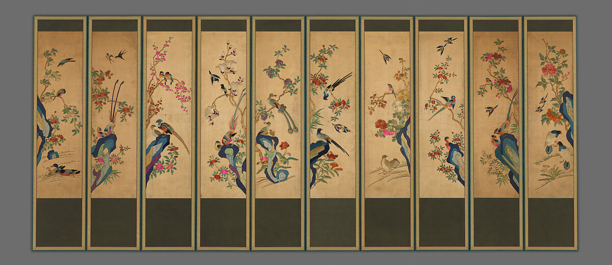 The history of inter-mediality between Korean painting and embroidery can be traced back to a 14th-century embroidered image of a Buddha. This late 19th-century 10-panel embroidered screen of birds and flowers illustrate the continued intersection of painting and embroidery in popular and sacred imagery. Each panel consists of two pairs of birds in a landscape of a rocks and flowering tree. Drawing inspiration from bird-and-flower and auspicious painting genres, the rocks are rendered in blue and purple tones and there are peonies, plum blossoms, chrysanthemums, camellia, and lilies.