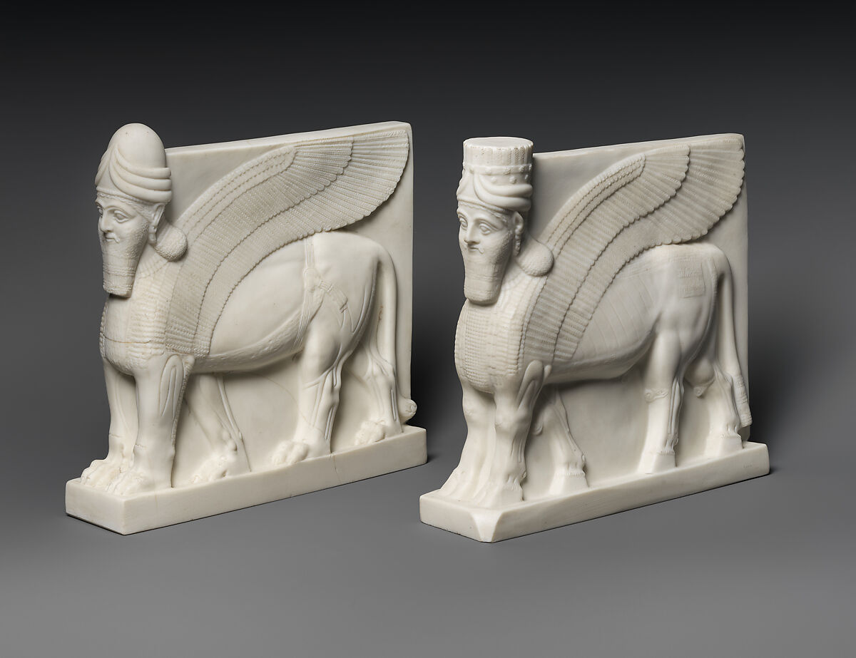 These sculptures are part of a series designed by Aaron Hays, a sculptor who worked at the British Museum, for sale both as decorative objects and as tools for teaching and study of the ancient sculptures. They are made in Parian ware, a ceramic recently developed at the Copeland factory that could be poured into molds to form complex shapes and whose pale finish was intended to evoke the Parian marble used in ancient Greek and Roman sculpture. This was not the gypsum alabaster of which the Assyrian sculptures themselves were made but was clearly suited to Victorian decorative tastes. The two figures here are miniature versions of a type of guardian, called lamassu or shedu; the originals were monumental sculptures that stood flanking important gateways in Assyrian palaces. At the time of the excavations these winged lions and bulls became icons of Assyrian art for the European public, and their images were reproduced in many media. These two sculptures are closely based on a particular bull and lion from Nimrud, ancient Kalhu, that were brought to the British Museum. Very similar sculptures from the same palace are today in The Met (32.143.1 and 32.143.2). The lion is a quite faithful copy of the Assyrian original. The bull is more complicated: in theory it is based on a bull from a different Assyrian palace at Khorsabad, ancient Dur-Sharrukin, but while its headdress is copied from that sculpture, the proportions of head and body are closer to the figures from Nimrud, making the lion and bull in the series feel like a matched pair. Unlike the originals, whose bodies were only carved on one side as the other was built into the wall, the Victorian pieces are modeled fully in the round.