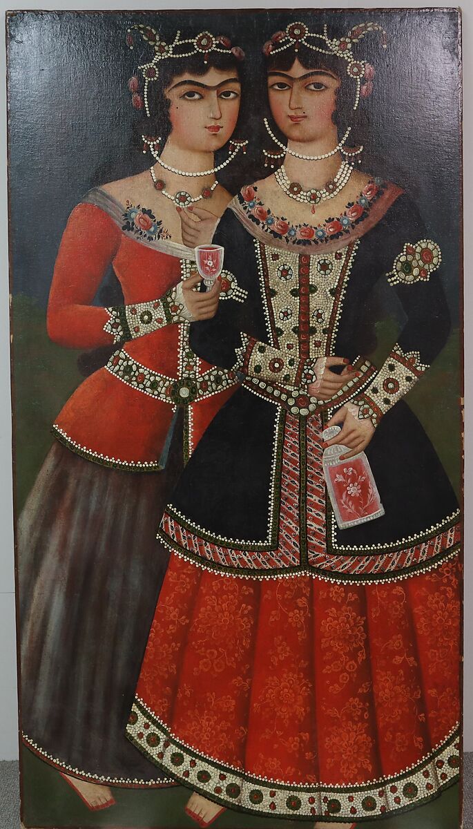 This delightful oil on canvas portrait of two Qajar beauties, possibly sisters, is distinguished by the elaborate jewel-studded and pearl-encrusted garments and headgear and the Western imported cut crystal goblet and decanter they hold. Although these are not actual portraits, their jeweled garments and accouterments suggest that they are court ladies rather than harem ladies and entertainers so frequently represented in paintings of women in this period. Paintings of women were rarely signed and dated, but the treatment of the facial features, the almond-shaped eyes, joined eyebrows, puckered lips, birthmarks, and rendition of the details of the garments place this work in the second quarter of the nineteenth century.