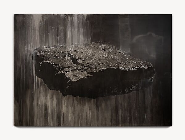 Here, the artist moves away from the vibrant color of her previous work for a two-tone palette of black and silver, hues that evoke not only the iron-studded rock but also the photographic process from which the image of the meteorite derived. The artist enhances the rock’s indentations and contours by hand and creates organic veils of paint by dragging, pushing, or tipping the medium onto the surface. The result is a painting that insinuates itself into the viewer’s space by virtue of its scale and the sensory encounter that it invites. Beautiful and terrifying, it asks us to consider the power of unseen forces that shape our lives.