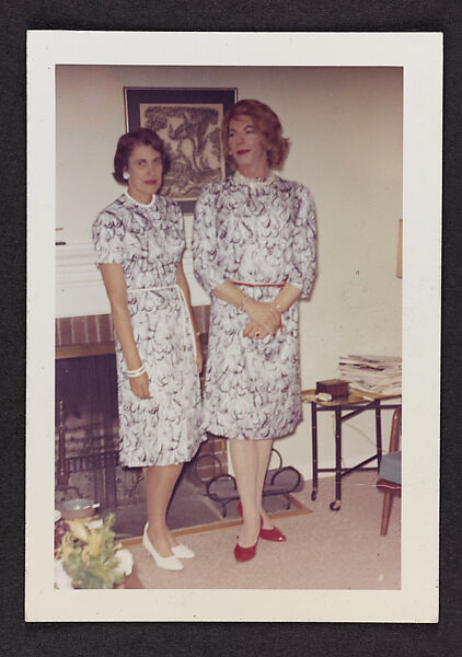 - Title: [Sheila with her wife, Avi, standing by the fireplace in matching dresses, Casa Susanna, Hunter, NY]
