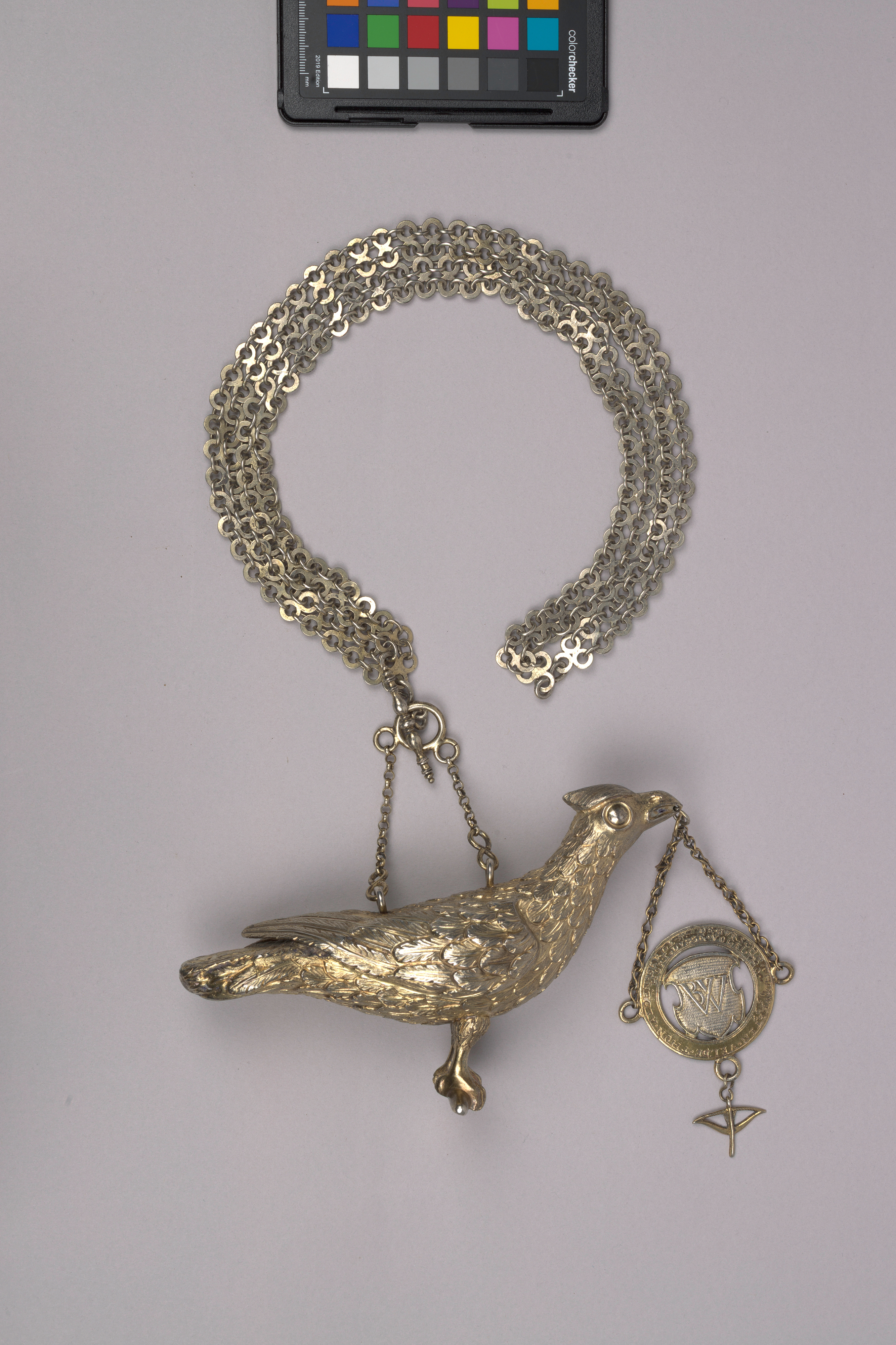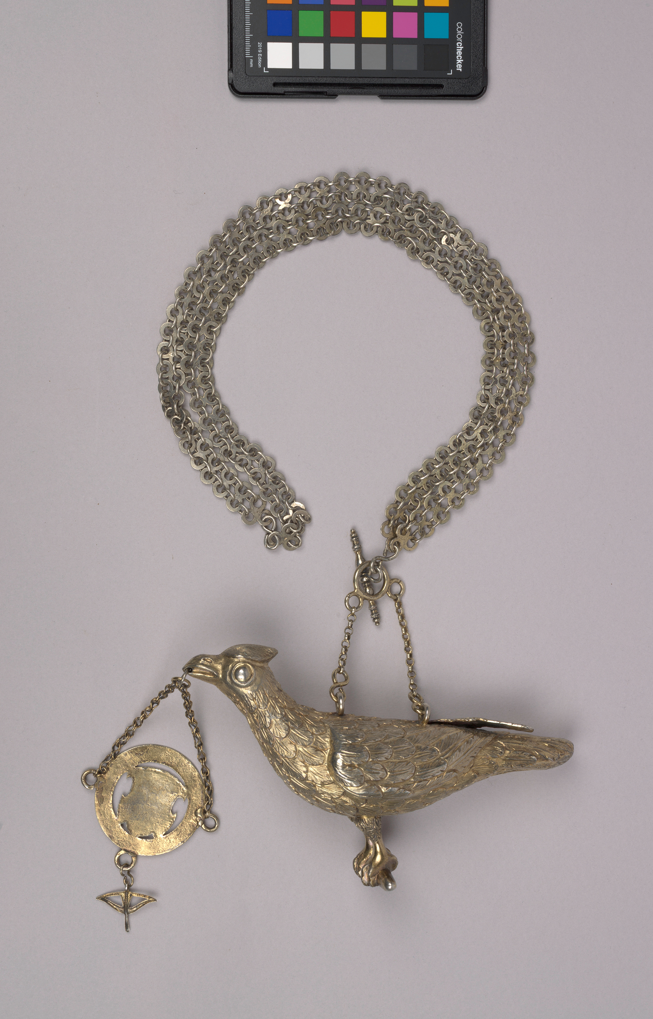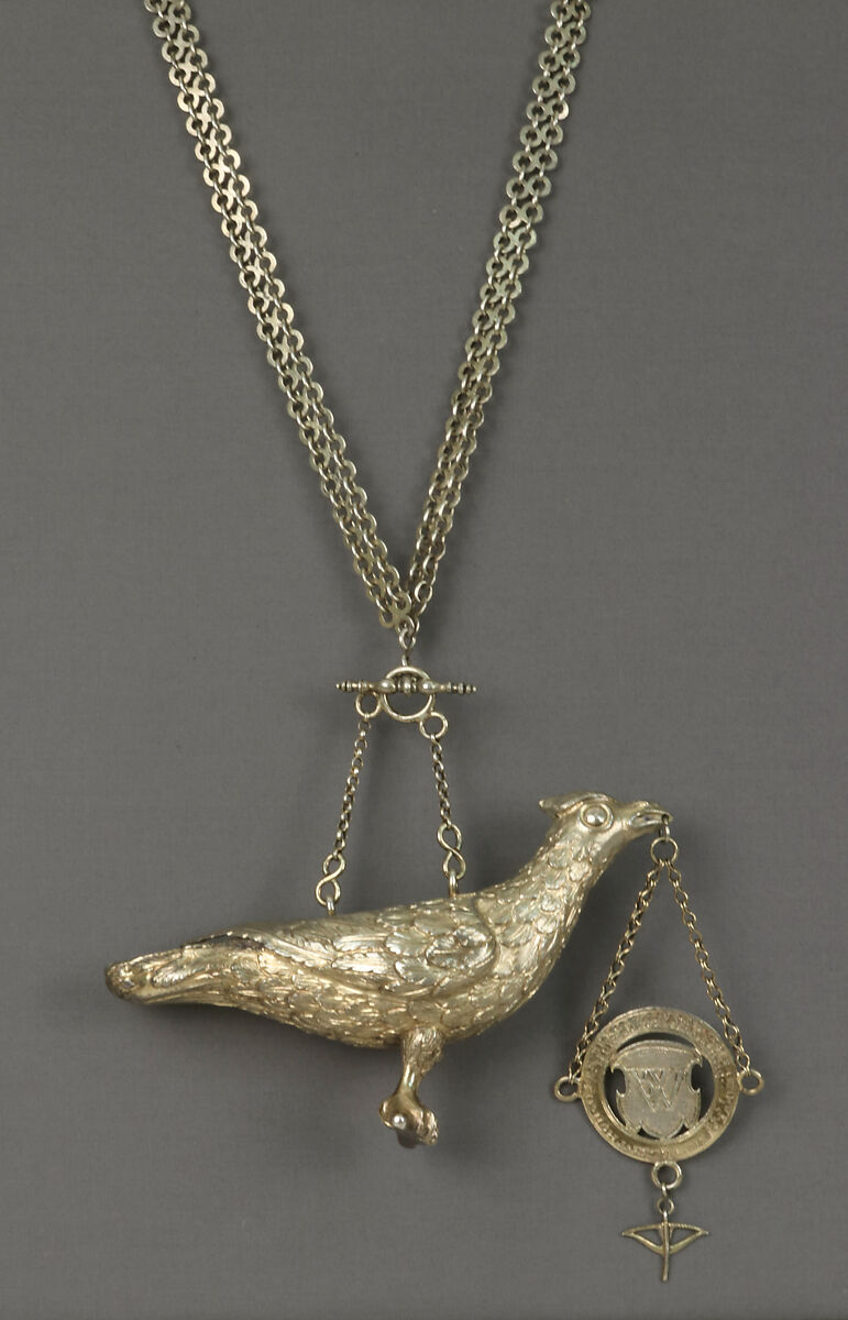 Designed to hang from a chain, this wearable trophy was granted to the winner of a shooting competition in the late sixteenth century. Schützenvögel or “shooting birds” were a popular form for this type of prize. Crafted from precious metals, they made appealing awards which commemorated the athletic prowess of a victorious archer or rifleman and were often reused, year to year. Community events, like shooting contests, certainly provided entertainment, but were also opportunities to increase social cohesion.
