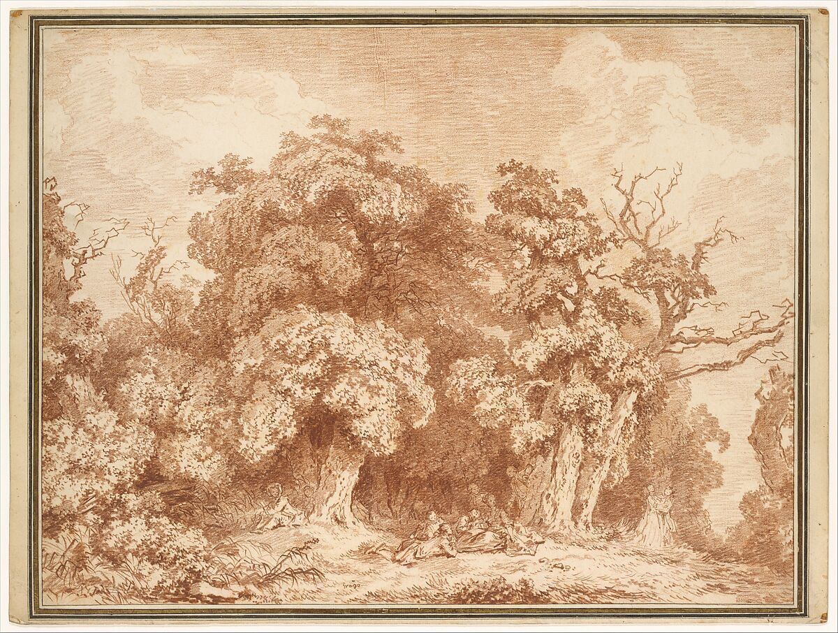 Unlike the majority of Fragonard's red chalk landscapes, made during a summer at Tivoli in 1760, this drawing is a work of the artist's maturity, probably dating to just before his second trip to Italy in 1773–74. Dense deciduous trees recall the forests around Paris rather than the Roman countryside. The unhesitating, even virtuoso, handling suggests that this is an independent work, probably created in the studio from a related plein-air study now in a private collection. A stand of mature trees, bursting with profuse sunlit foliage, guards the shady entrance to the woods. In a characteristic manipulation of scale, Fragonard presents small groupings of elegant figures, half lost in shadow, as restrained echoes of the vigor and fecundity of the overgrown landscape. The dramatic naturalism associated with the Dutch landscapists, especially Jacob van Ruisdael, is here merged with a vision of nature as a welcoming milieu for aristocratic dalliance, a legacy of Watteau's fêtes galantes.