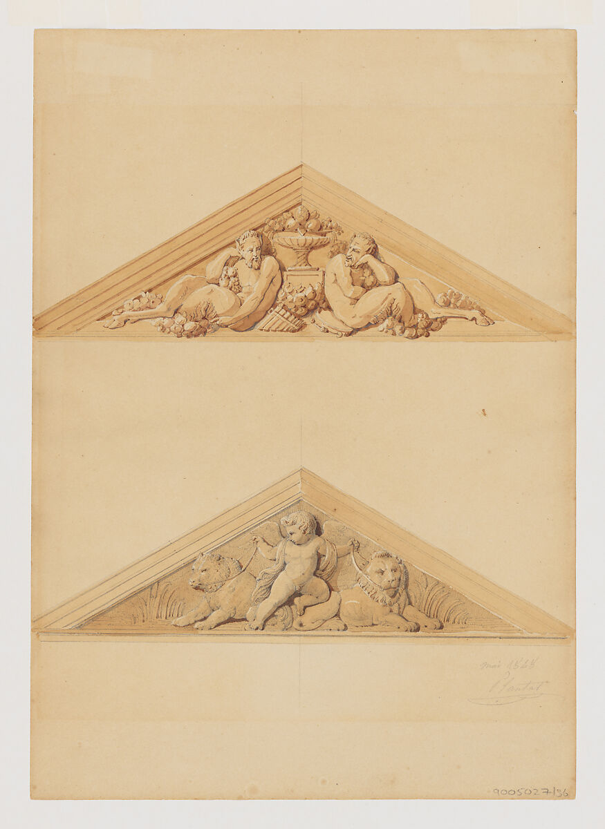 - Title: Two Designs for Pediments, one with Satyrs, one with a Putto and Two Lions