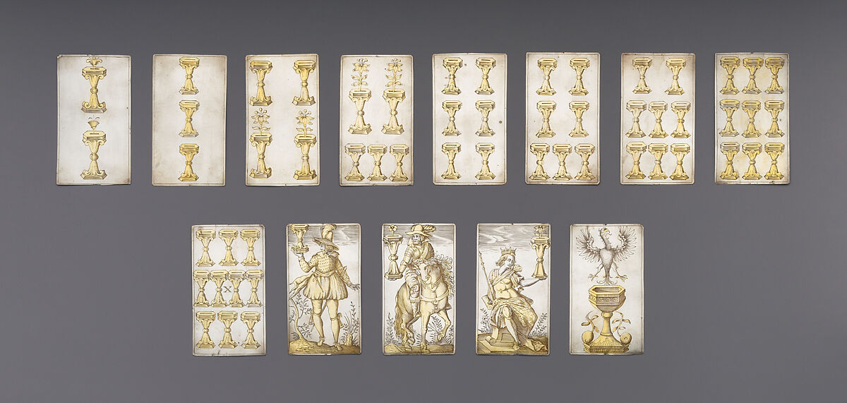 From the finely executed pip cards to the charming face cards, this set of silver-gilt playing cards reflects aristocratic fondness for both luxury and quality. Although they were never intended to be used in a game, the careful execution of the engraving captures all the necessary elements for a full deck of Italian playing cards. The kings, knights, and knaves are finely modeled in the manner of prints and their varied costumes make them both elegant and playful. An extraordinary set like this one may not have graced the felt of the card table or witnessed a bet or two, but they would have been evidence of the elevation of leisure by the wealthy and the collecting tastes of the elite at the start of the seventeenth century.