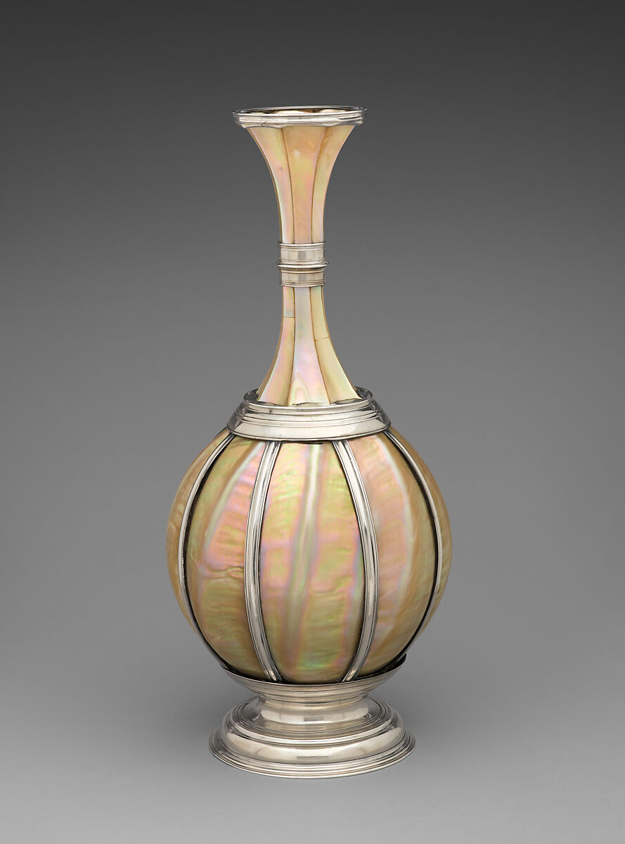 Precious materials from far away countries were elevated and integrated into European goldsmith practices. This elegant flask, in the shapes of a rosewater sprinkler, with its sophisticated curves and eye-catching iridescence, is evidence of an interest in the materials and forms of Asian arts long held by European collectors. Here, the mother-of-pearl panels cut from several turbo marmoratus snails were sourced and shaped by an Indian artist, likely from the state of Gujarat. After the precious object had traveled over three thousand miles, Viennese goldsmith Andreas Joseph Rath fitted the flask with silver mounts in 1733. Although the name of the Gujarati artisan does not survive, his or her talented craftsmanship stands out in the skillful reveal of the nacre and its rippling surface. While the mother-of-pearl is the raison d'être of the object, the silver mounts girdle and guide it, giving the impression that the exuberance of the natural material is being just barely contained by the silver additions, which serve primarily to exhibit its delicate opalescence.