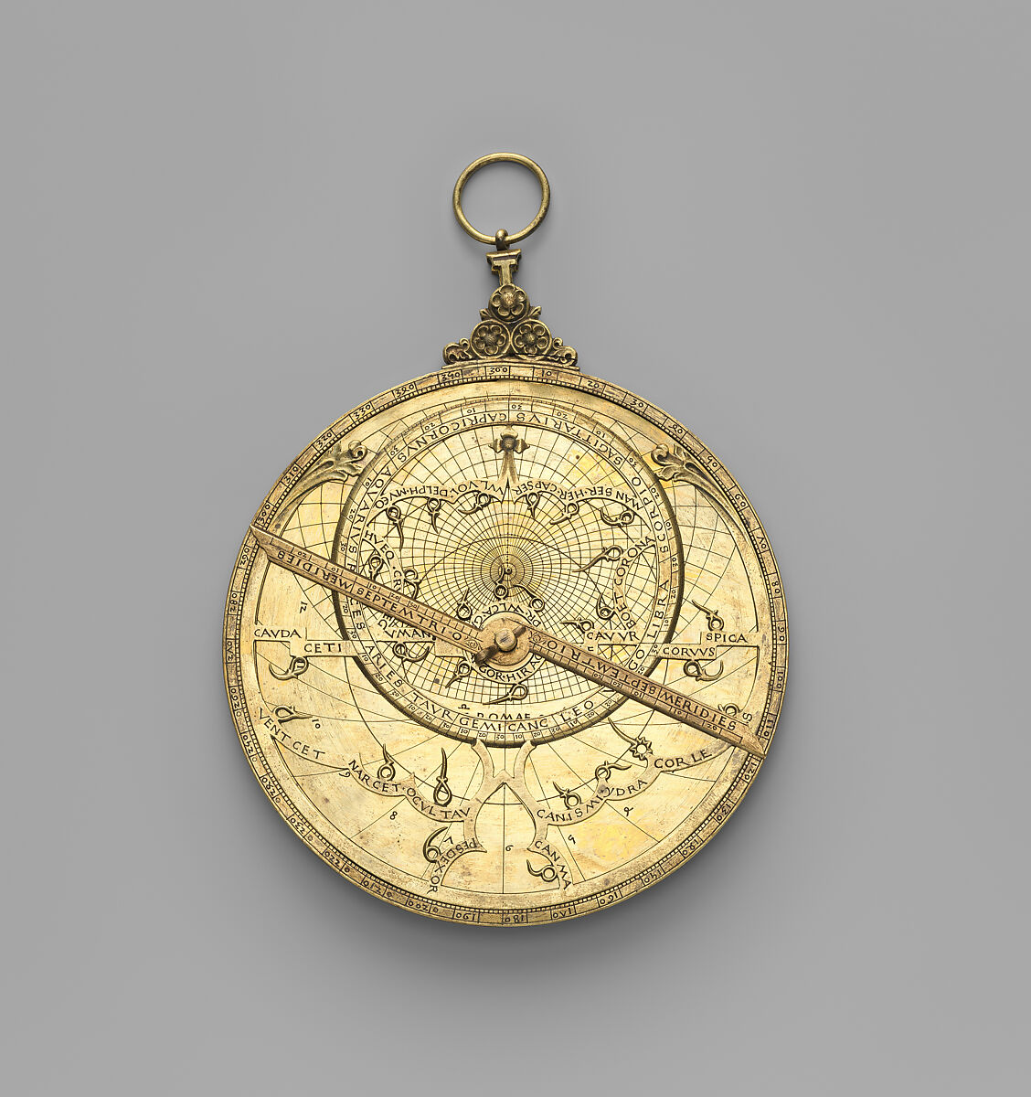 Medieval stargazers had a refined understanding of the movements of heavenly bodies. This was thanks in part to the astrolabe, a scientific instrument whose two-dimensional representations of heaven and earth enable the user to make complex astronomical calculations for the purposes of celestial navigation, surveying, and telling time, among many other tasks. This exceptional example brings together art, science, and faith, as its engraved decorations celebrate God’s agency in the universe. On its front face, a delicate, openwork star map portrays the night sky as a graceful dance of heavenly bodies. On the engraved reverse, a contemplative angel with wings protectively outstretched alludes to the divine ordering of the cosmos. Additionally, this astrolabe commemorates the meeting of two of the liveliest minds of the fifteenth century. Its inscription names the work’s patron, Cardinal Bessarion (1403-72), a Greek theologian and scholar whose remarkable career carried him from Byzantium to Italy, as well as its maker, John, thought to be the celebrated German astronomer known as Regiomontanus (1436-76).
