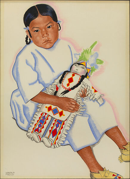 This tender portrait of a young Blackfeet child reveals Reiss’s highly distinctive and immediately recognizable style of pastel drawing in its innovative compositional design as well as the intense emotional depth of the figure. Depicted close to the picture plane and wearing a loosely rendered white garment defined by assured blue and pink strokes of pastel, she commands the viewer’s attention with her vivid face, framed by black-plaited hair secured with blue ribbons. In her lap she holds a large doll, also sporting black braids, dressed in detailed beaded regalia with attached greenery, possibly for ceremonial purposes. Reiss paints this young girl with great seriousness, sensitivity, and specificity. Community-engaged research into her identity is ongoing.