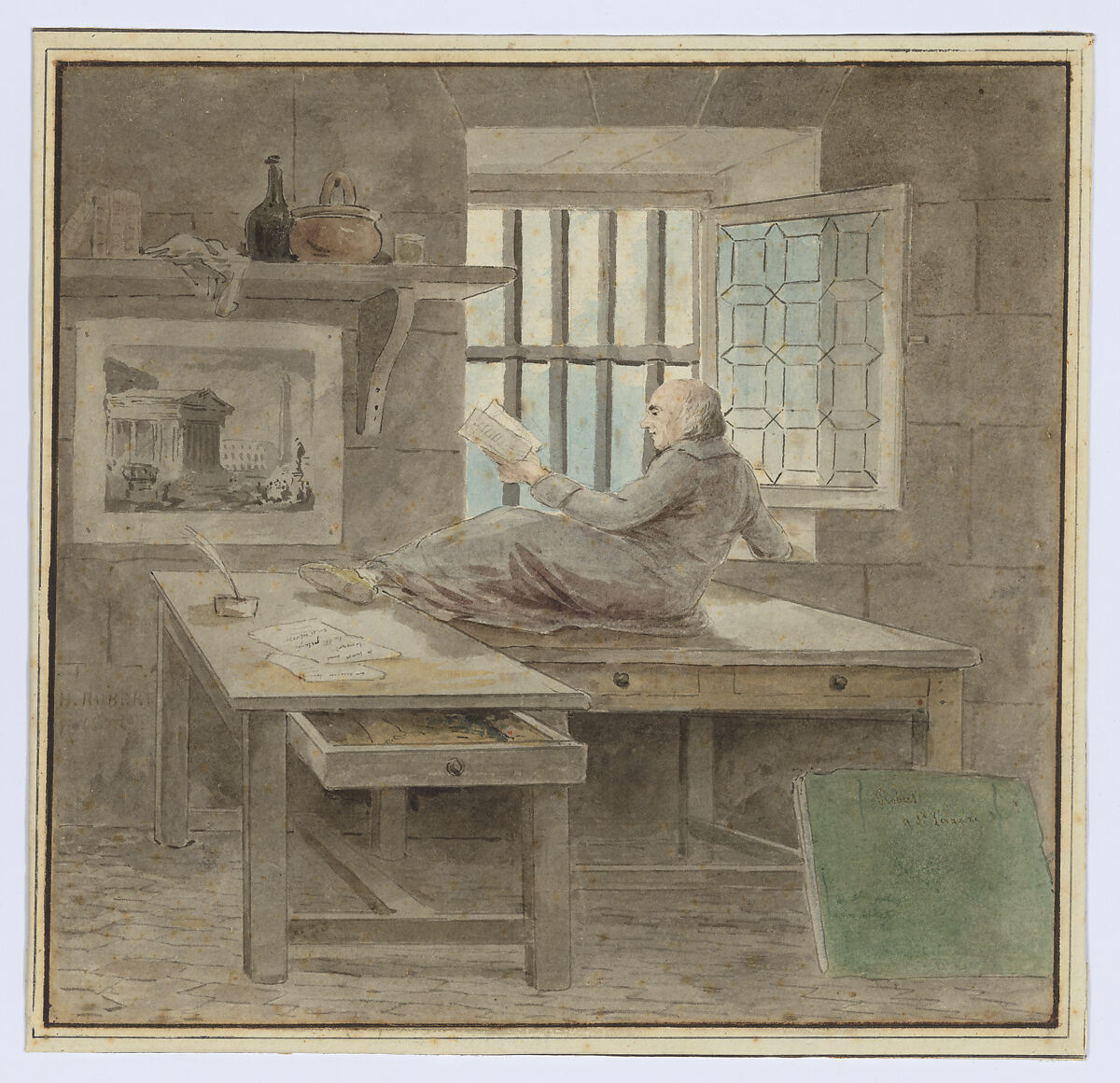 Like many artists who had worked for royal and aristocratic patrons during the ancien régime, Robert was imprisoned during the Terror. Here, he depicts himself, easily recognizable by his dark eyebrows and receding hairline, in his cell at the Saint-Lazare prison.