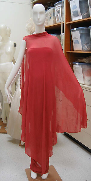 Giorgio di Sant’Angelo began his career in fashion with designs for plastic jewelry in the late 1960s. Early examples were featured in Vogue magazine under editor, Diana Vreeland and earned Sant’Angelo a Coty Award in 1968. His first clothing collections were inspired by traditional Romany and Native American dress and reflected the multicultural and do-it-yourself aesthetics of the hippie movement. The designs, which rejected the strictly tailored forms of the previous decade, featured natural silhouettes achieved through wrapping, layering, and tying fabric around the body. They earned the designer his second Coty Award in 1970. Sant’Angelo’s popularity waned along with the mode for eclecticism and fantasy in the early 1980s. He returned to favor in the late 80s with designs for wrapped, body conscious garments in brightly-colored silk stretch gauze.