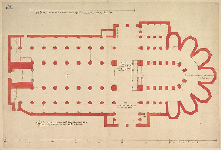 In 1632, Saenredam spent several months in the town of ‘s-Hertogenbosch, which Dutch Protestant forces had recently reconquered from the Spanish. In ground plans and drawings, Saenredam carefully documented the town’s historic churches, including the Sint-Pieterskerk shown here, which would be demolished only fourteen years after his visit. The austerity and mathematical precision of the depiction lends the work a documentary authority that is characteristic of Saenredam’s work. His removal of the pulpit and pews, elements associated with Protestant worship, indicates he may have made this painting for a Catholic collector who was nostalgic for former times.